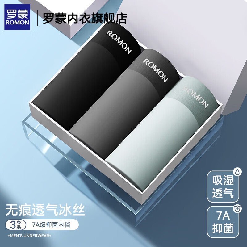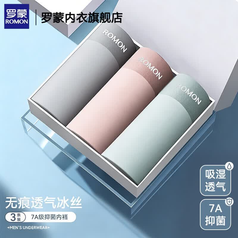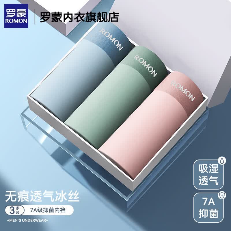 罗蒙(ROMON)无痕冰丝内裤7A级抑菌120支抗菌裆部夏季男士平角内裤冰丝内裤男 3条装水蓝+草绿+粉色 120S冰丝无痕 7A石墨烯. 3条 2XL 130-150斤 【7A级抗菌/冰丝无痕】
