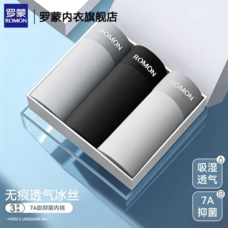 罗蒙(ROMON)无痕冰丝内裤7A级抑菌120支抗菌裆部夏季男士平角内裤冰丝内裤男 3条装黑色+深灰+白灰 120S冰丝无痕 7A石墨烯. 3条 2XL 130-150斤 【7A级抗菌/冰丝无痕】