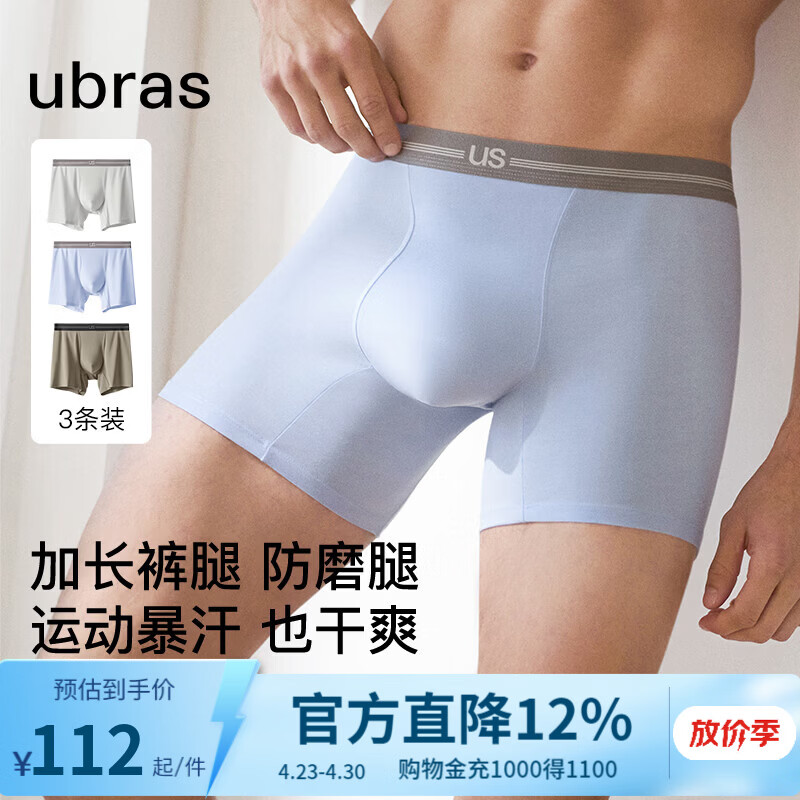 ubras26年新款15A抗菌轻运动吸湿速干男士四角裤内裤男(三条装) 拿铁棕色+晴空蓝色+浮银灰色 3条 2XL