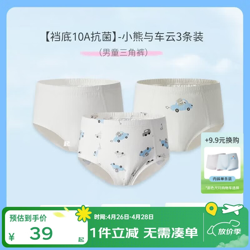丽婴房(Les enphants)儿童内裤纯棉内裤男女童内裤四角不夹PP中大童平角裤抗菌三条装 【棉】小熊与车云-三角男童 【裆底10A抗菌】 3条 90 CM/2岁