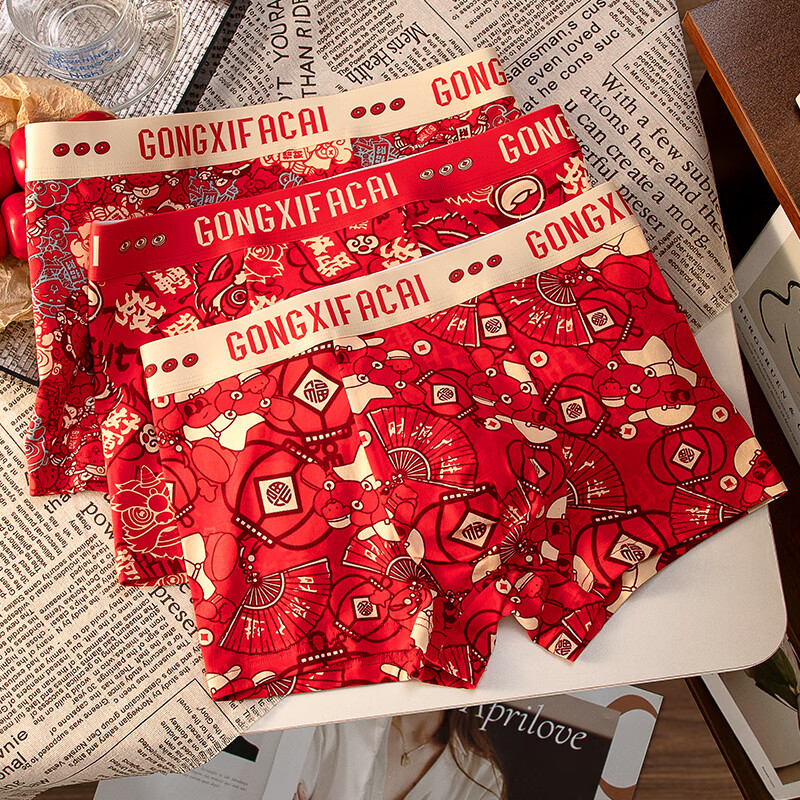 羅亨士本命年内裤男士纯棉平角裤红色马年2026年新款结婚四角印花短裤头 招财猫+福字+时来运转 3条 2XL 130-150斤