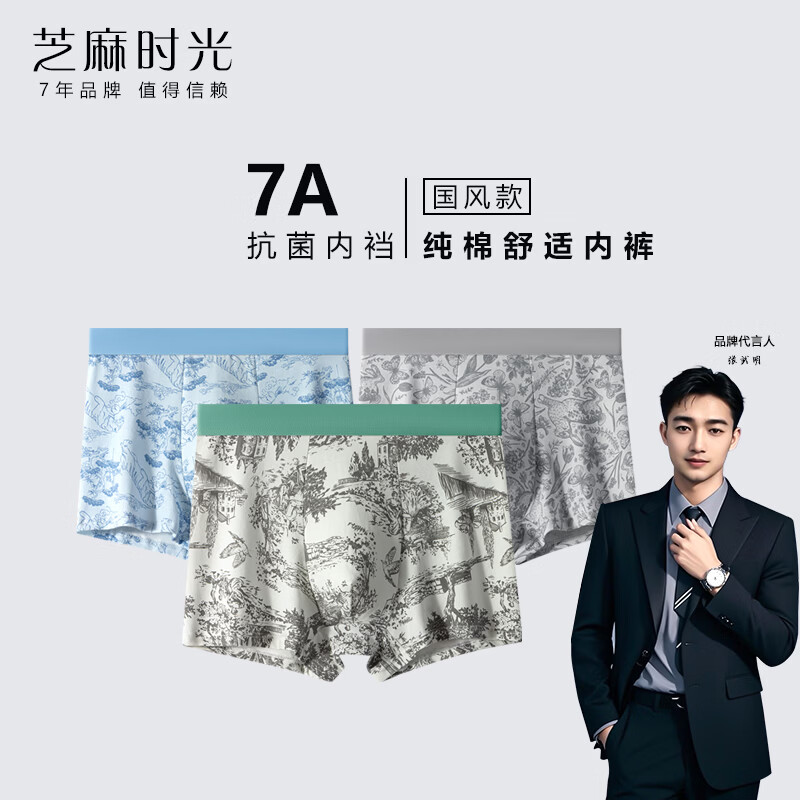 芝麻时光抗菌底档 内裤纯棉男内裤男全棉95%棉短裤衩四角裤正品 纯棉【国风款】【3条装】混色 2XL 建议【120-140斤】