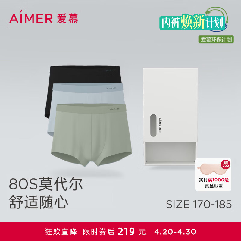 爱慕先生(AIMER MEN)【礼盒3件包】轻薄柔软80s莫代尔全随心抗菌透气内裤男春夏 碧落兰/水墨灰/灰绿 3条 2XL (180)