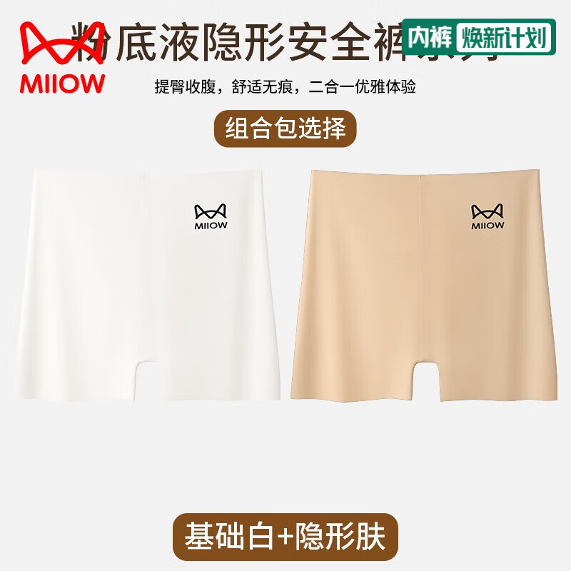 猫人女士内裤2条装安全裤高腰冰丝无痕二合一不卷边短裤抑菌裆打底裤 基础白+隐形肤(三分裤) L (100-120斤)