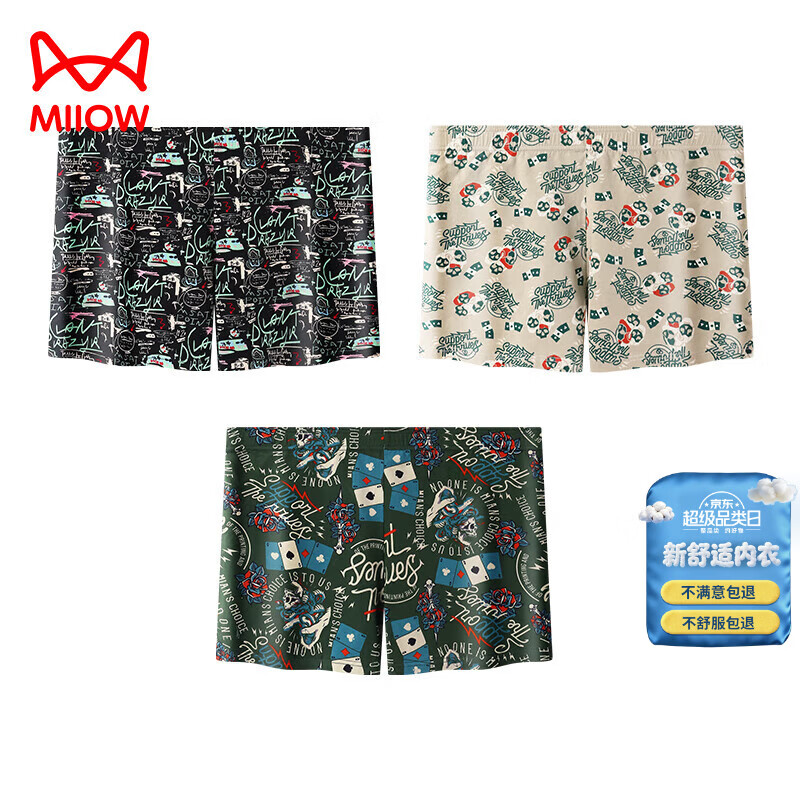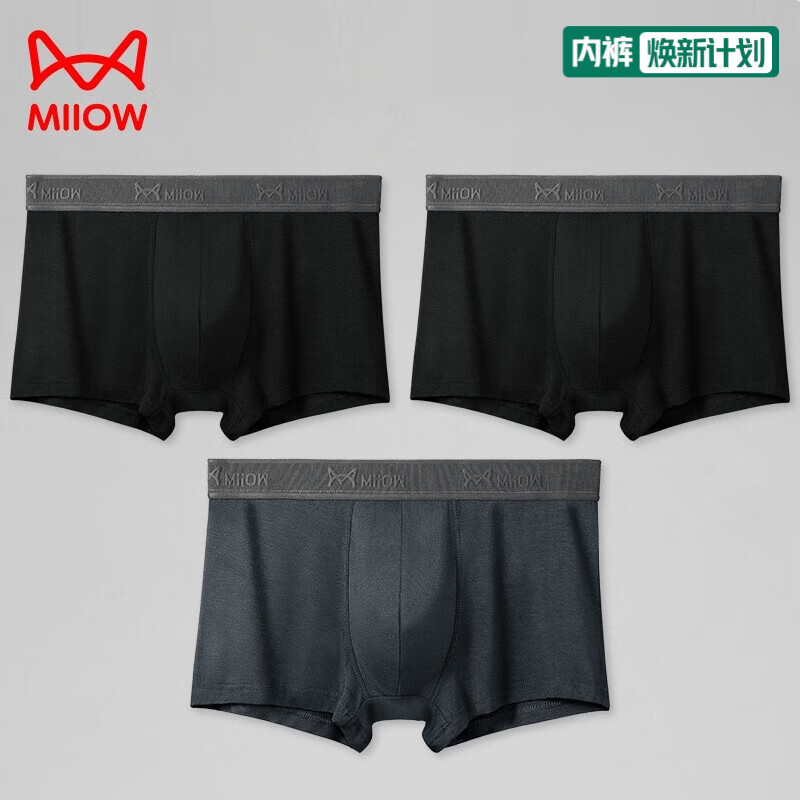 猫人(MiiOW)3条装男士内裤莫代尔男棉质抗菌内档平角裤透气中腰四角裤 黑色x2+灰色 3XL (140-160斤)