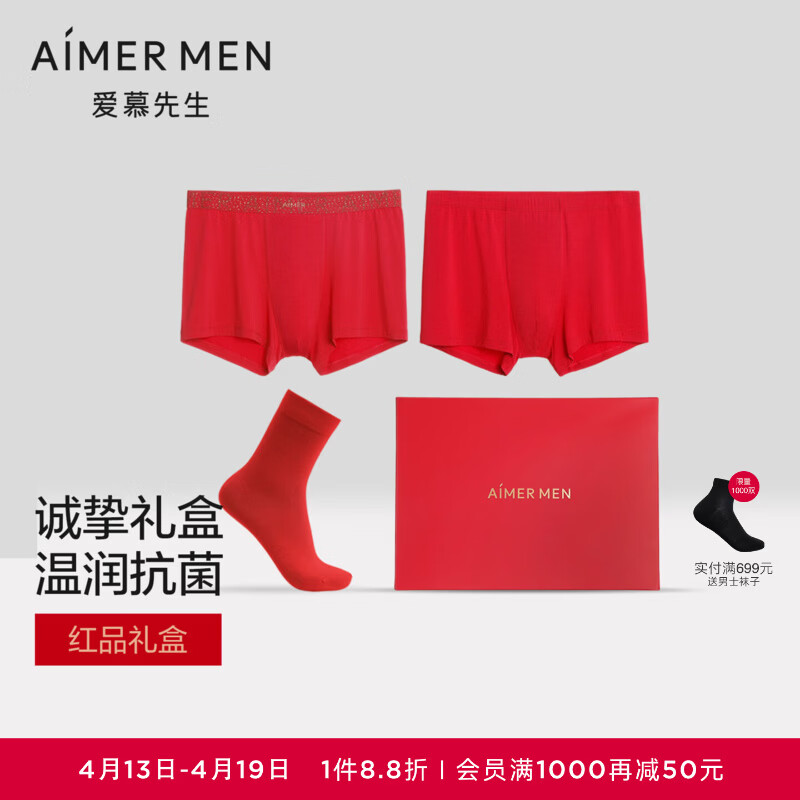 爱慕先生【本命年红礼盒】含氨基酸蛋白质抗菌莫代尔红内裤红袜子礼盒套装 大红77G 2条 3XL 185