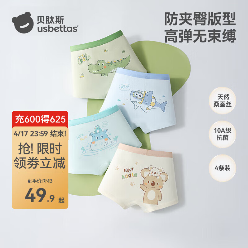 贝肽斯男童内裤夏季儿童a类纯棉3-6岁男孩青少年6-12岁平角短裤 动物游乐园 4条 100 码(建议20-30斤)