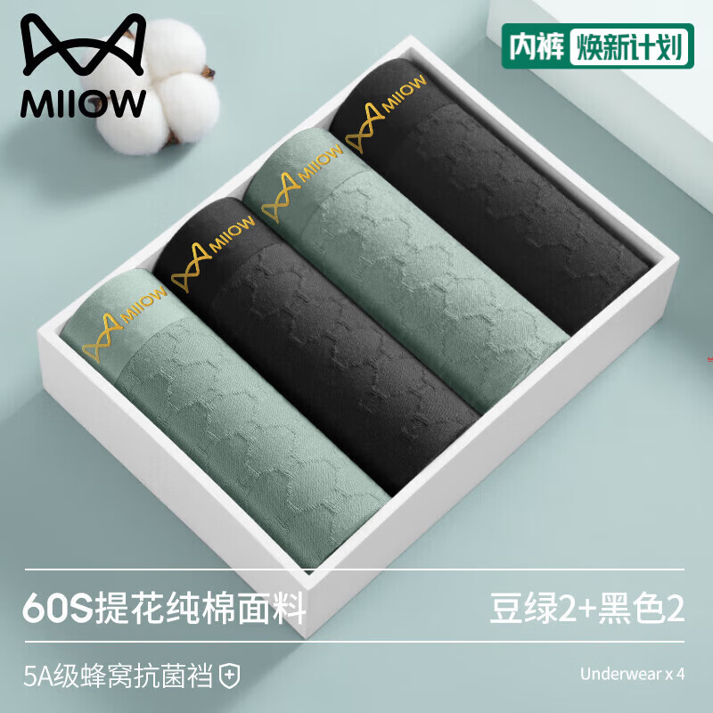 猫人无痕男士内裤男纯棉抗菌裆四角裤衩薄款大码男生平角运动短裤头 (豆绿2+黑色2) 4条 3XL (建议155-180斤)