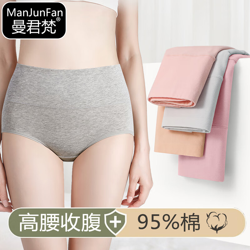 曼君梵 纯棉高腰内裤简约女士纯色棉质三角裤收腹舒适透气高腰亲肤内裤 【3条装】灰色+肤色+粉色 2XL (130-160斤左右)