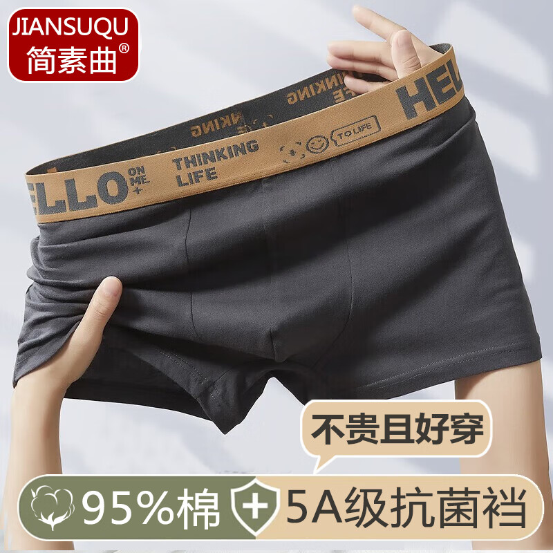 简素曲 纯棉5A抗菌男士内裤舒适平角裤纯色棉质四角裤时尚潮流Hello内裤 【5A级抗菌裆部】 颜色随机 2条 3XL (140-165斤)
