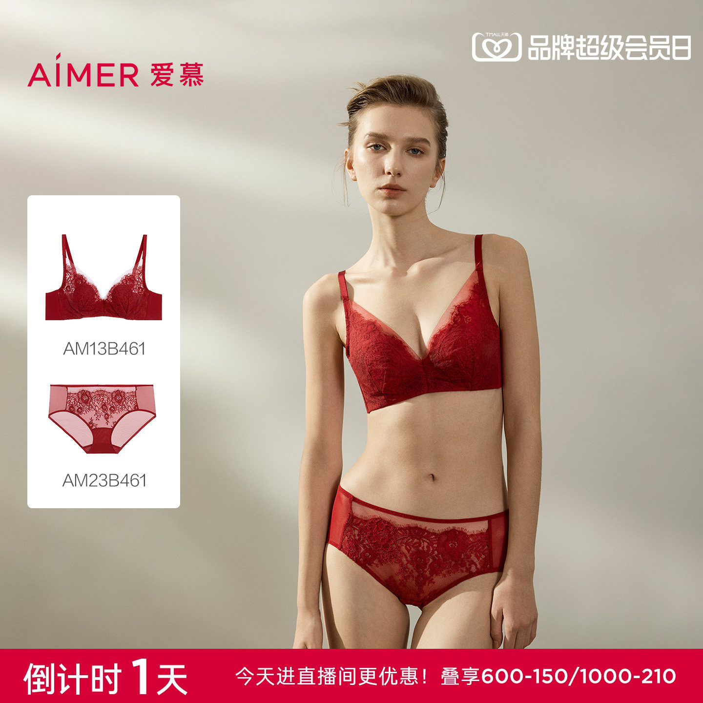 爱慕光羽蕾丝红色花瓣内衣女薄杯隐孔蕾丝大胸显小文胸内裤套装