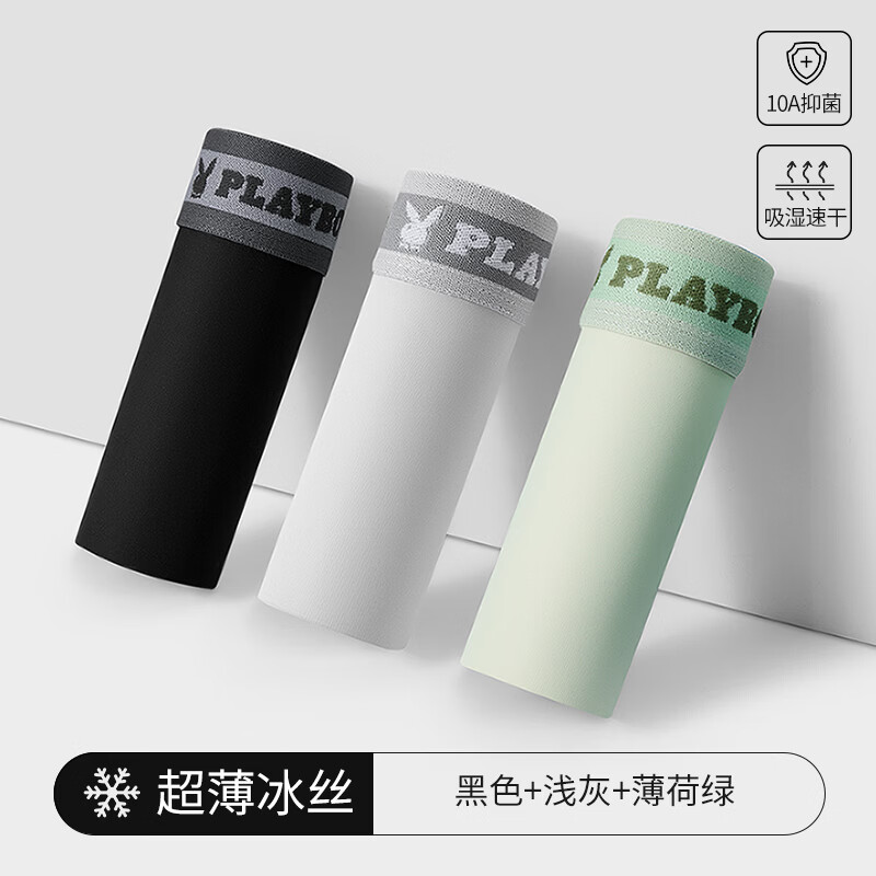 花花公子(PLAYBOY)男士内裤男冰丝10A抗菌短裤头无痕凉感平角裤大码男生四角裤衩夏 【真冰丝·10A抗菌】黑色/浅灰/薄荷绿 3条 2XL (建议体重130-150斤)