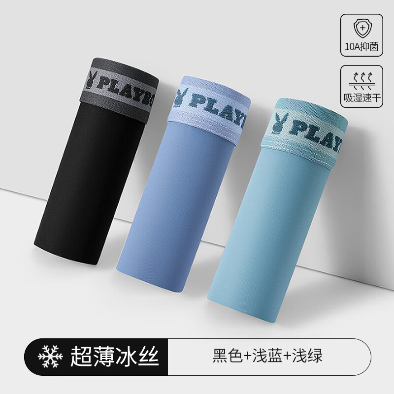 花花公子(PLAYBOY)男士内裤男冰丝10A抗菌短裤头无痕凉感平角裤大码男生四角裤衩夏 【真冰丝·10A抗菌】黑色/浅蓝/浅绿 3条 2XL (建议体重130-150斤)