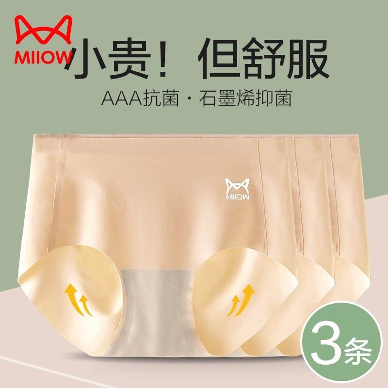 猫人冰丝内裤女中腰无痕3条装一片式透气蜜桃臀石墨烯抑菌裆薄款三角 肤色+肤色+肤色 3条 2XL (140-160斤)