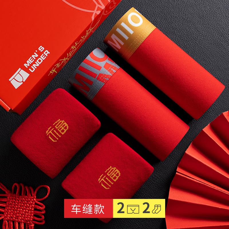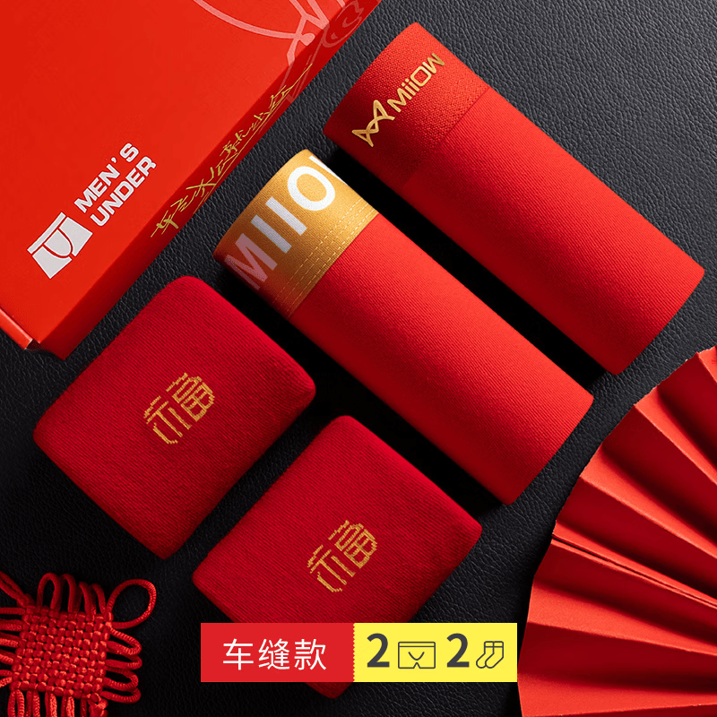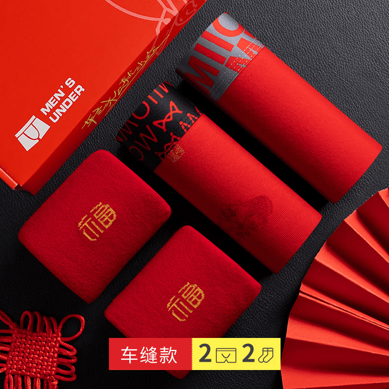 猫人男士内裤5A抗菌本命年红色四角裤鸿运结婚大码男式平角短裤衩 净色/金巾/大红袜[2条+2双] 3XL (建议145-165斤)