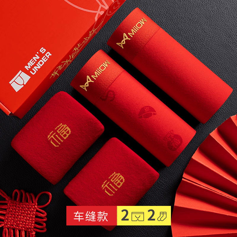 猫人男士内裤5A抗菌本命年红色四角裤鸿运结婚大码男式平角短裤衩 净色/印花/大红袜[2条+2双] 3XL (建议145-165斤)