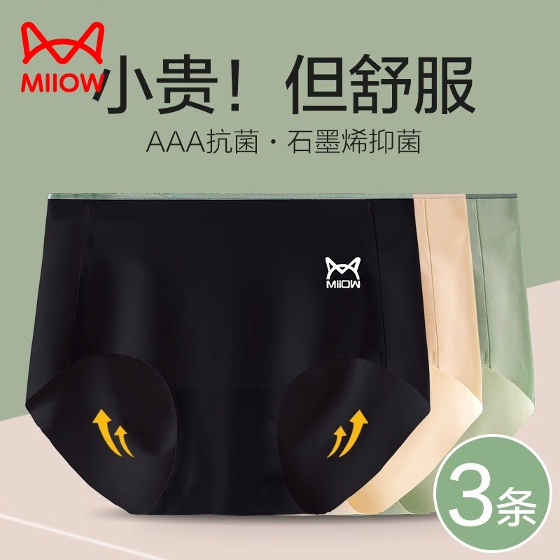猫人冰丝内裤女中腰无痕3条装一片式透气蜜桃臀石墨烯抑菌裆薄款三角 黑色+肤色+果绿色 3条 2XL (140-160斤)