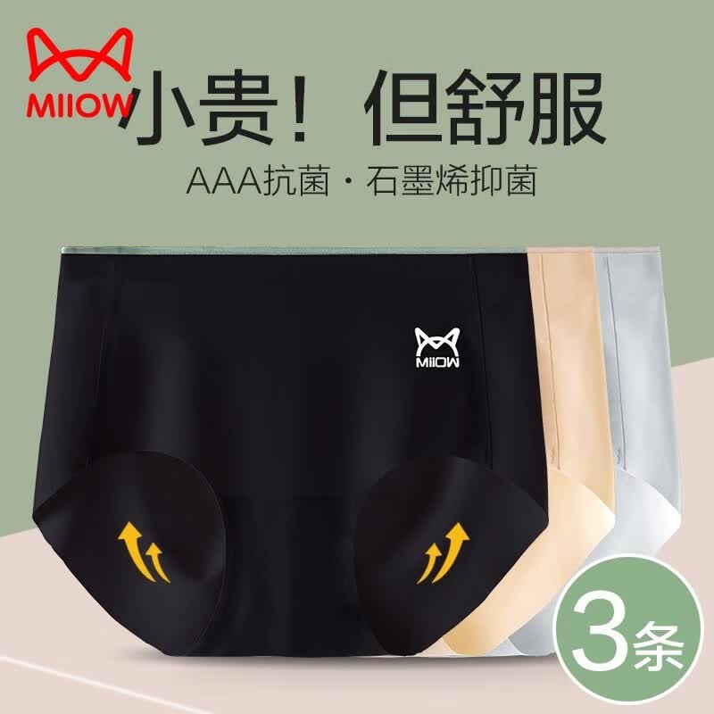 猫人冰丝内裤女中腰无痕3条装一片式透气蜜桃臀石墨烯抑菌裆薄款三角 黑色+肤色+蓝灰色 3条 2XL (140-160斤)