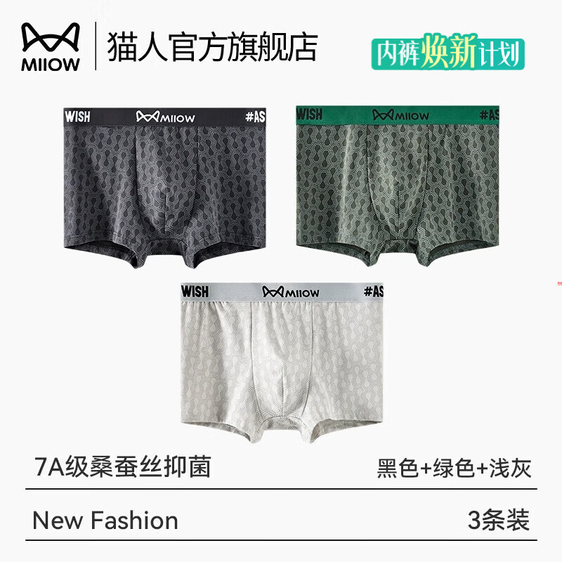 猫人男士内裤男生新款纯棉抗菌四角裤衩青年透气大码平角短裤男款 【黑色+绿色+浅灰】 3条 2XL 【推荐120-140斤】
