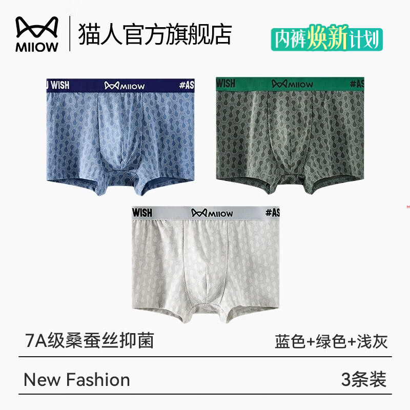 猫人男士内裤男生新款纯棉抗菌四角裤衩青年透气大码平角短裤男款 【蓝色+绿色+浅灰】 3条 2XL 【推荐120-140斤】