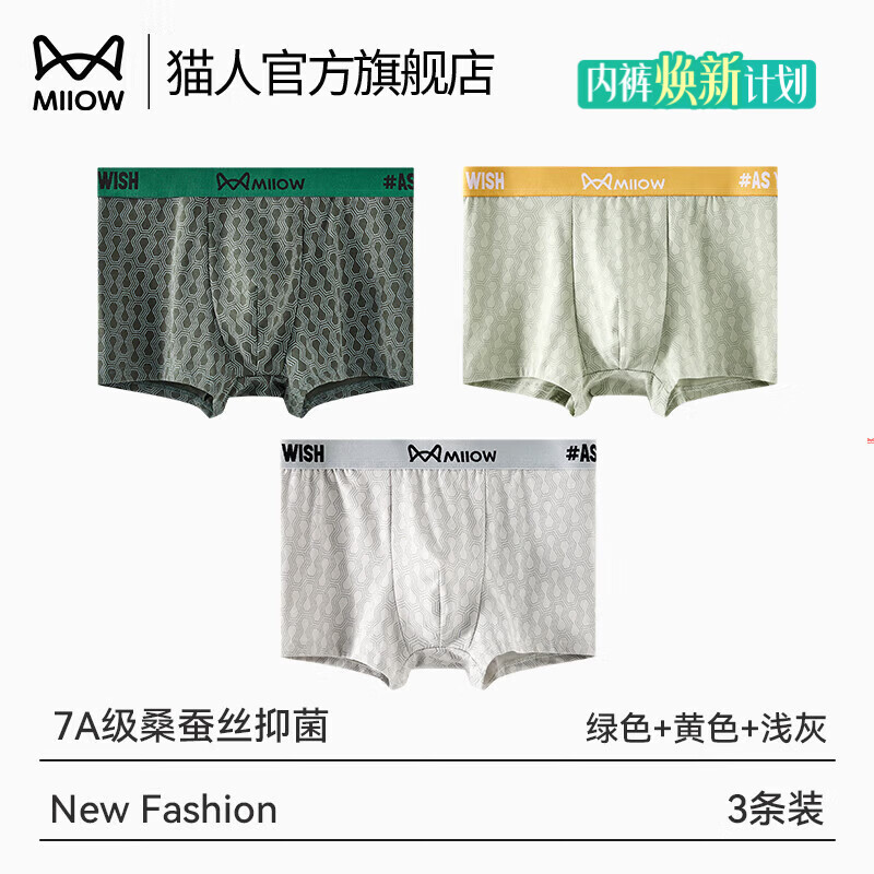 猫人男士内裤男生新款纯棉抗菌四角裤衩青年透气大码平角短裤男款 【绿色+黄色+浅灰】 3条 2XL 【推荐120-140斤】