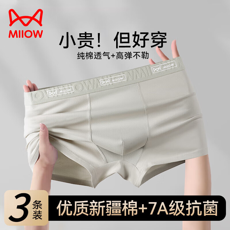 猫人无痕男士内裤纯棉抗菌四角短裤男生透气平角裤头男款底裤衩 黑色、宝蓝、浅灰 3条 2XL 【建议体重130-150斤】