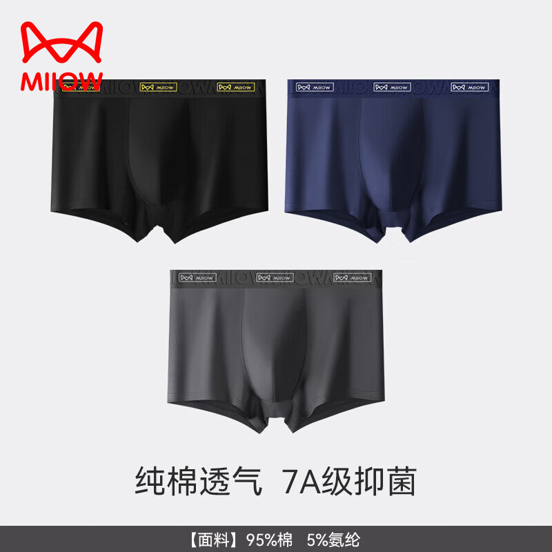 猫人无痕男士内裤纯棉抗菌四角短裤男生透气平角裤头男款底裤衩 黑色、宝蓝、深灰 3条 2XL 【建议体重130-150斤】