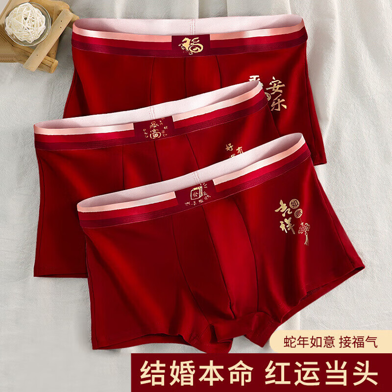 本命年男士内裤大红色男生四角短裤头底裤衩结婚送礼新款 3条-福气+好运+吉祥 2XL 120-140斤