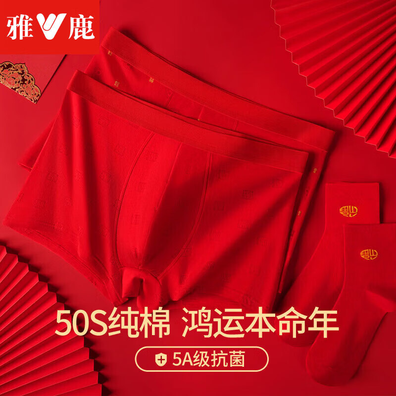 雅鹿4条装男士内裤男本命年大红色纯棉抑菌裆平角短裤龙年结婚礼盒 【2内裤+2袜子-礼盒】 CU0036 2条 3XL 【建议150-160斤】