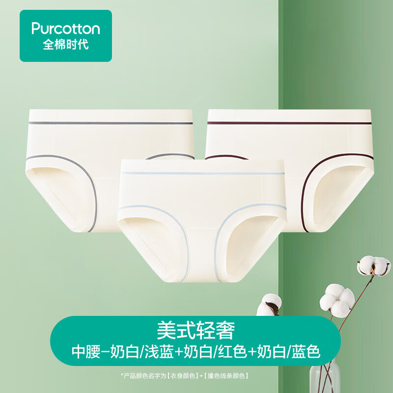 全棉时代女士内裤7A抗菌透气95棉宽边撞色线条成人内裤女士3条装 奶白(浅蓝+红色+蓝色) 2XL