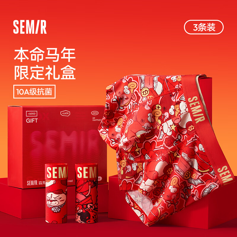 森马红内裤男士本命年马纯棉裆10A抗菌平角情人节结婚礼物礼盒3条2XL