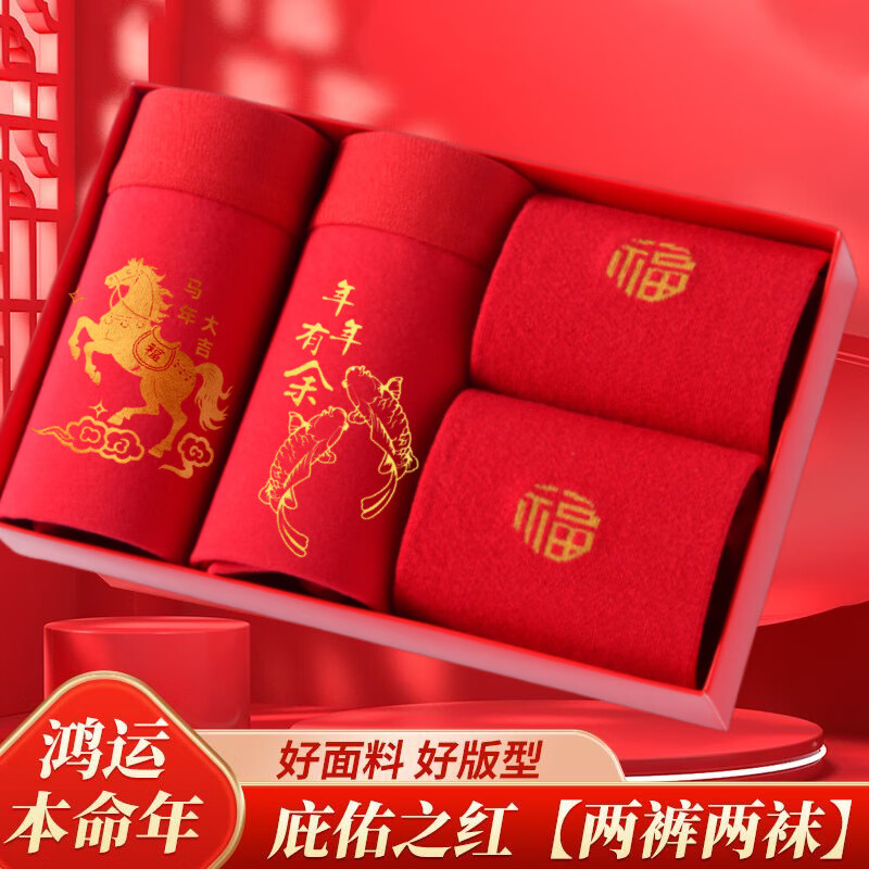 莫代尔本命年内裤男纯棉平角裤大红色男士大码四角裤属马男袜子内裤礼盒 纯棉礼盒【好运+金福+2双福袜】 3XL 【建议140-160斤】