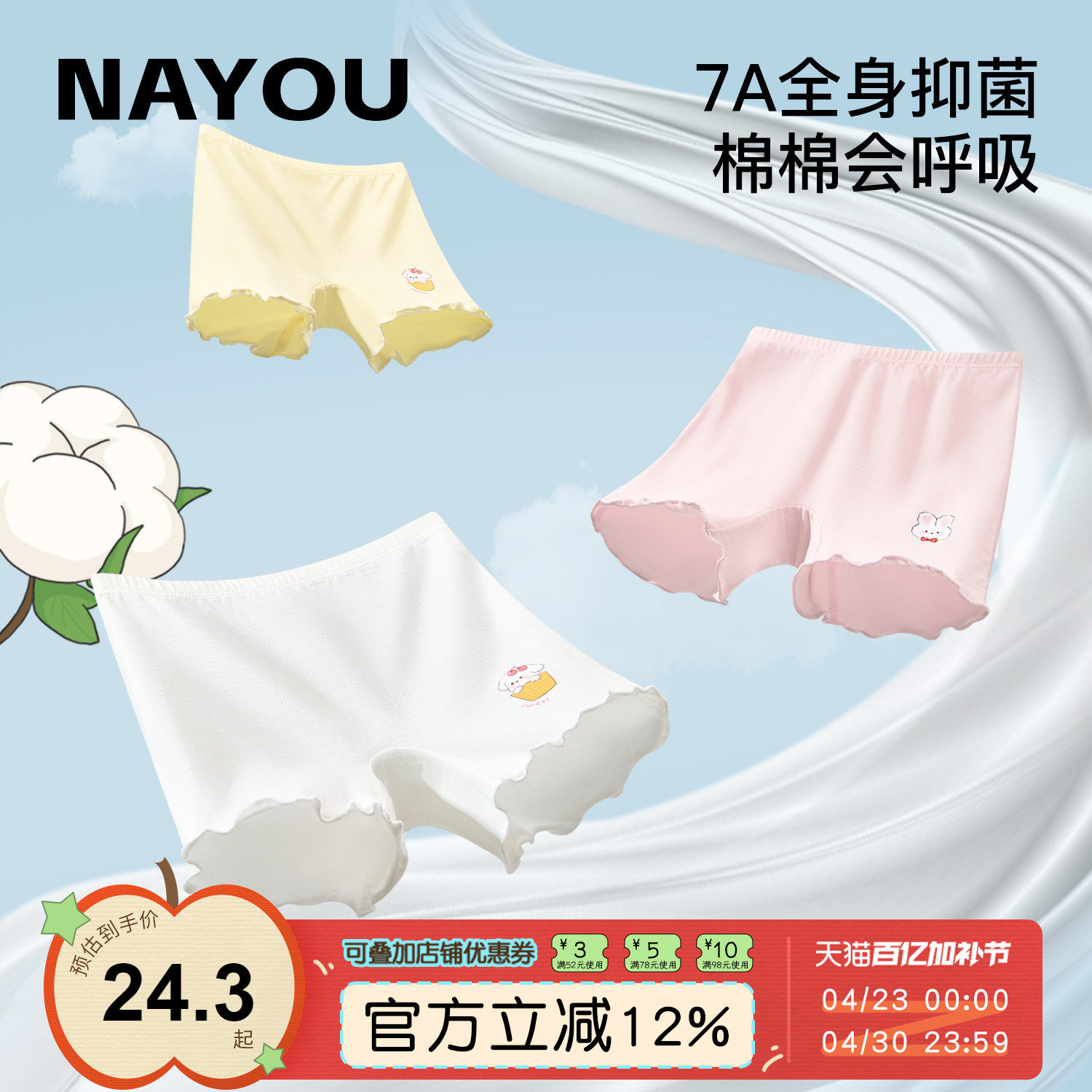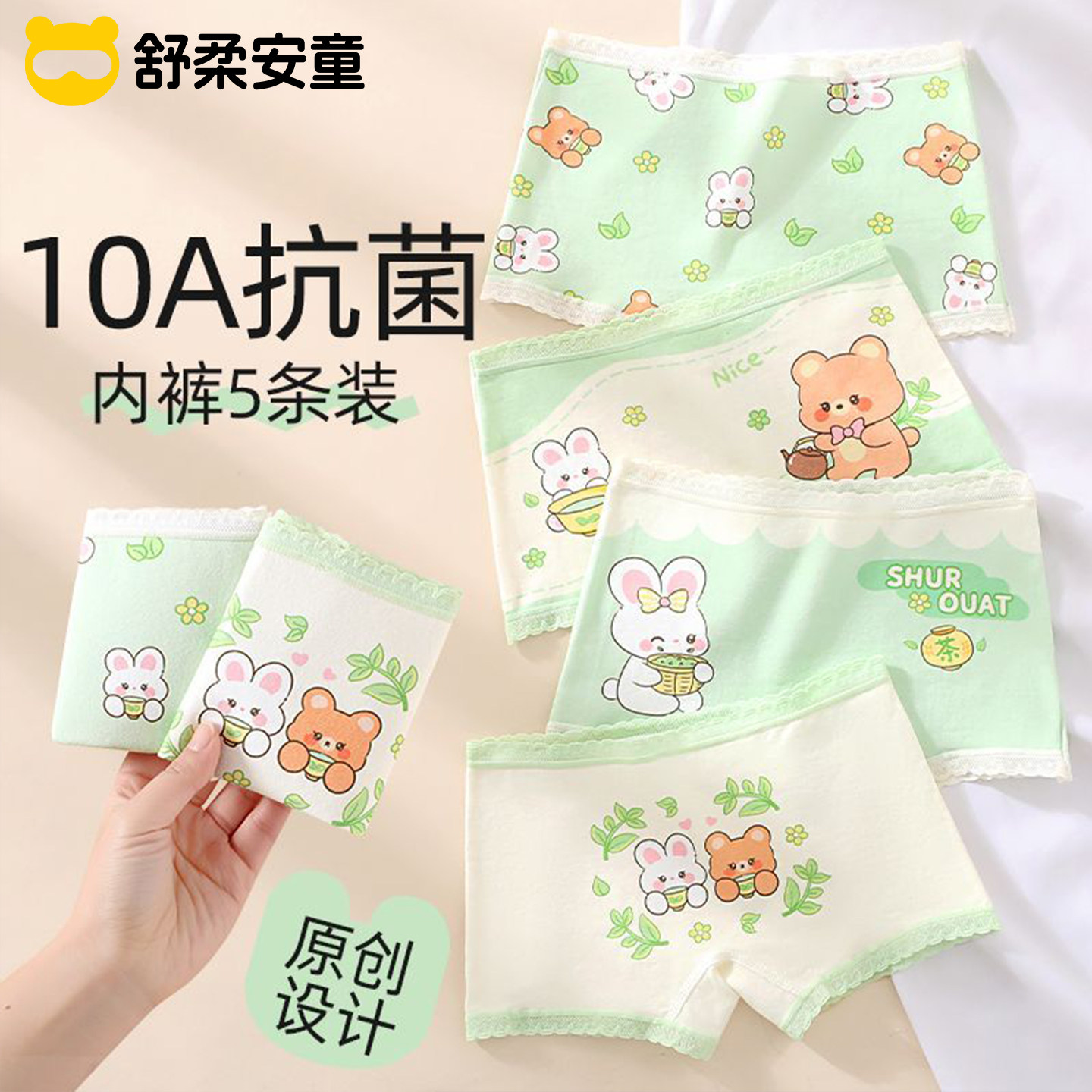 全棉母婴纯棉平角短裤儿童内裤女童宝宝四角裤女孩全抗菌100%不夹