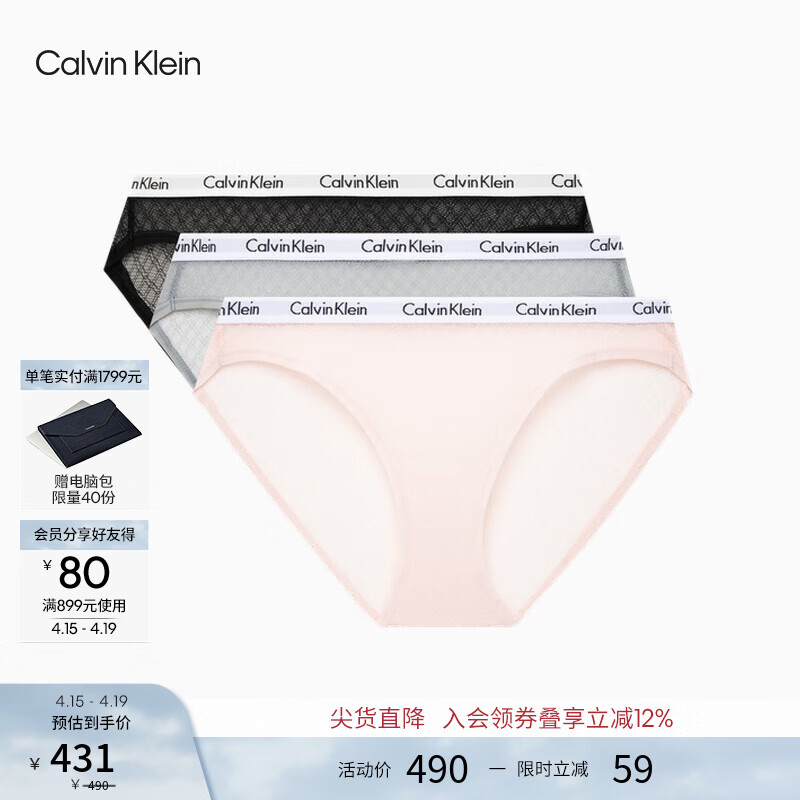 Calvin Klein内衣女士三条棉质裆ck性感薄纱蕾丝比基尼内裤女 5H2-太空黑/冰川灰/樱花粉 3条 M