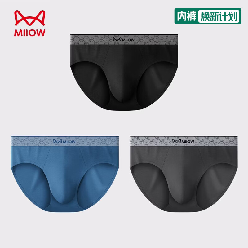 猫人3条装男士全棉内裤10A级抑菌裆中腰男式三角裤u凸短裤头宽腰内裤 黑色+深灰+彩蓝 2XL (130-150斤)