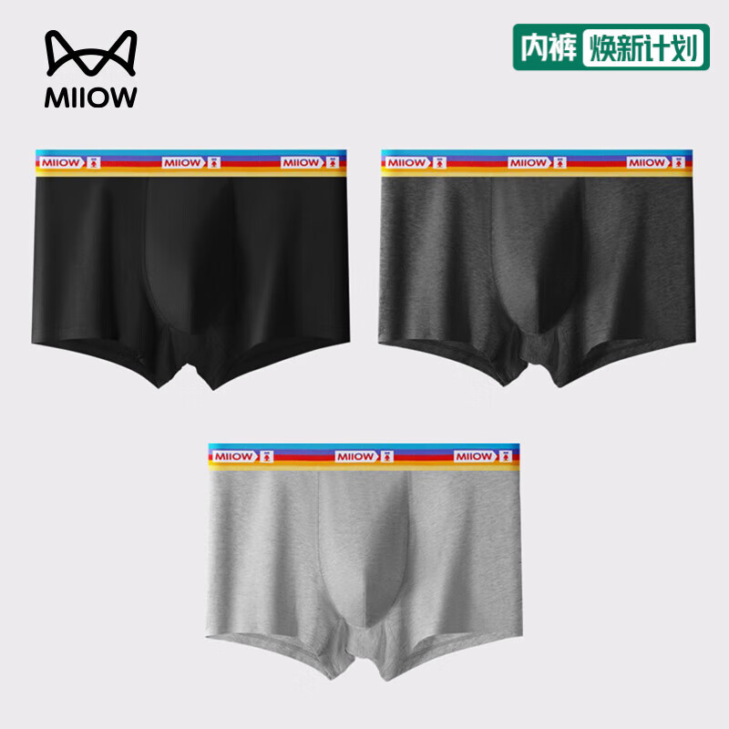 猫人(MiiOW)男士内裤男纯棉5A裆平角裤青年中腰四角裤短裤衩底裤头运动宽松款 3条 经典简约F 装 2XL 建议体重140-160斤内