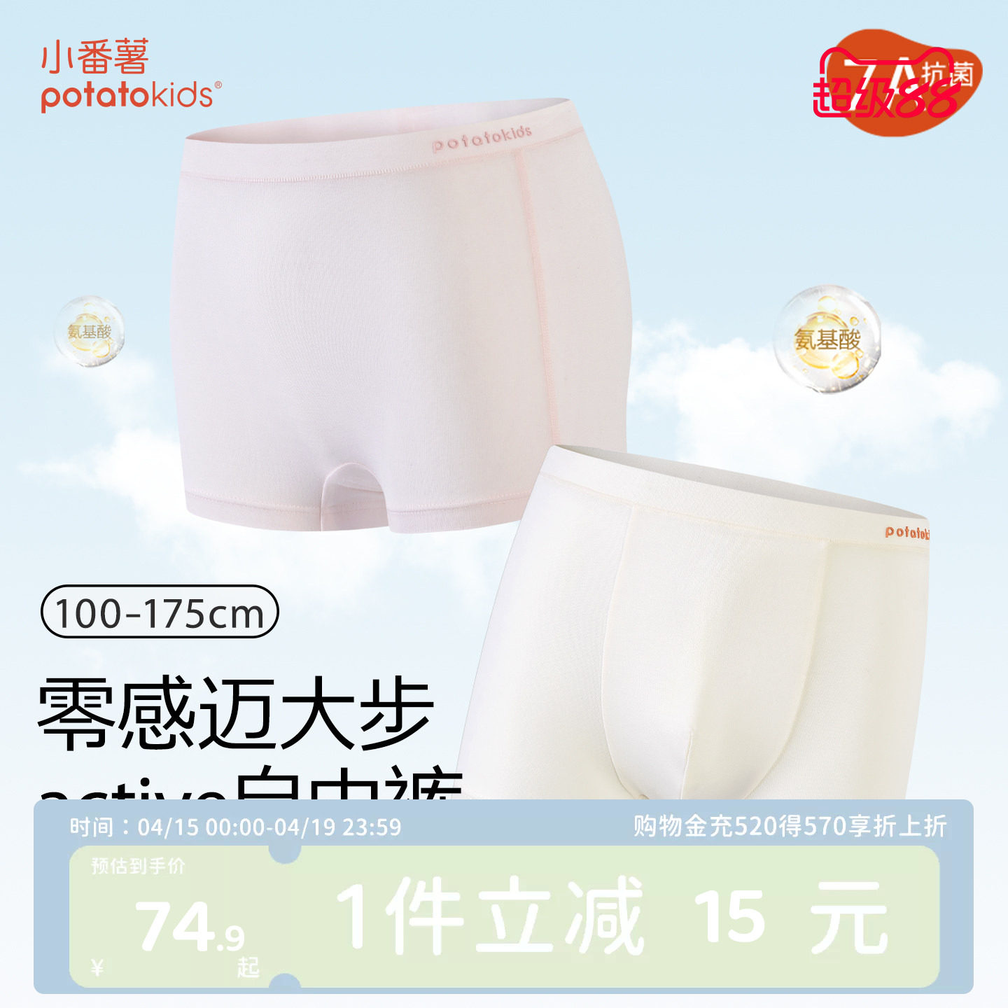 小番薯potatokids莫代尔男童女童透气7A抗菌平角儿童自由内裤