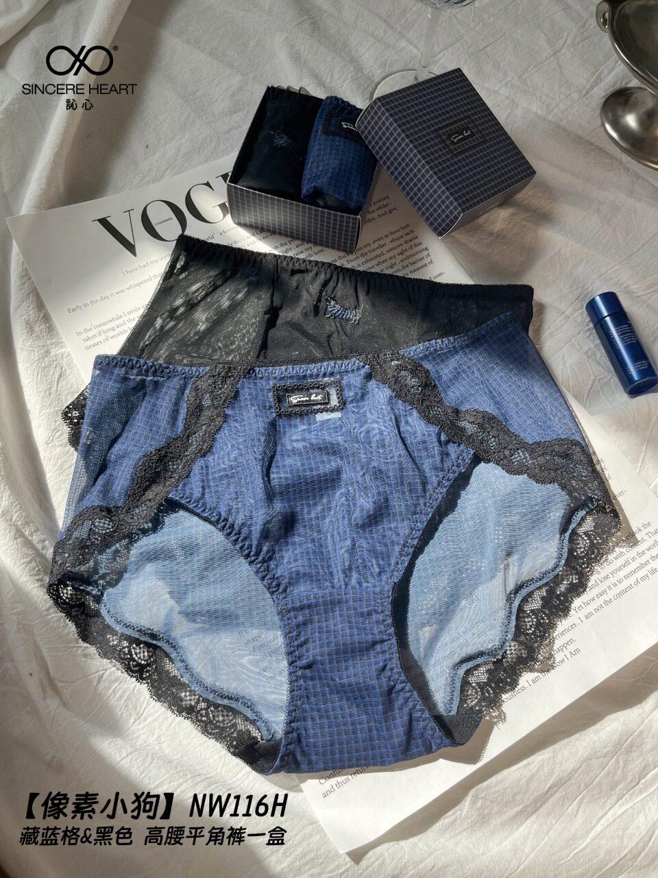訫心蕾丝网纱性感内裤中高腰无痕包臀花边透明诱惑纯棉裆三角裤黑