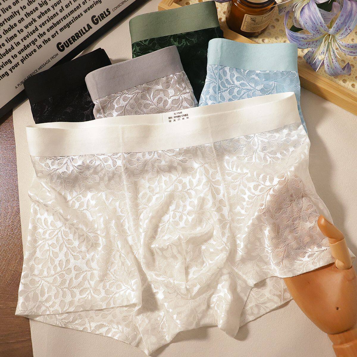 新款男士冰丝内裤透明性感透气四角轻薄性感蕾丝男内裤网纱平角裤