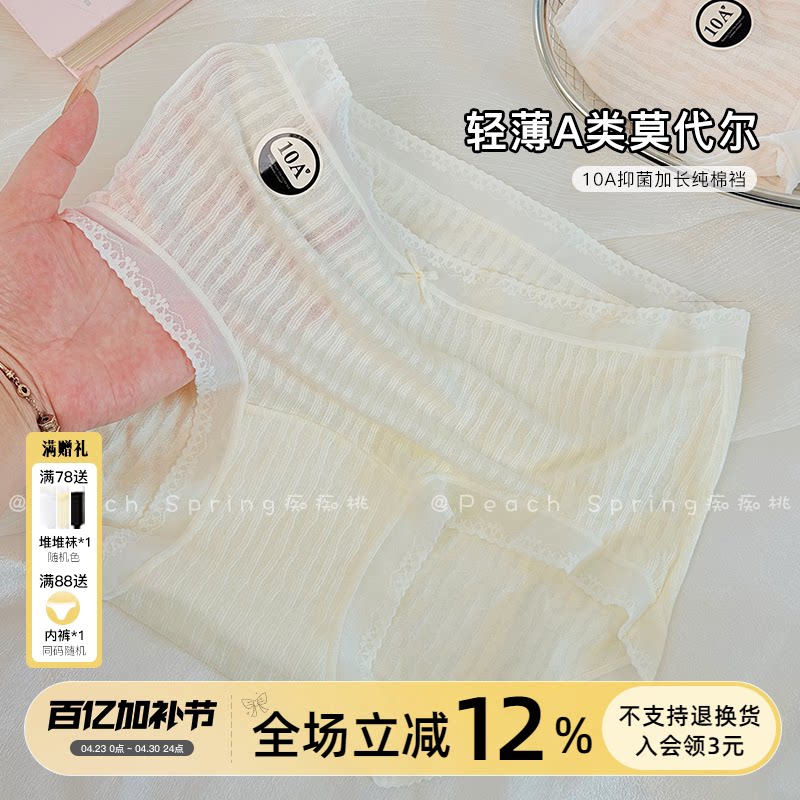 「白梨煮水」A类莫代尔内裤女生高透气不闷纯棉加长裆10A抑菌冰丝