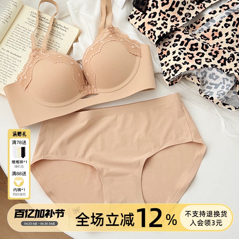 温柔裸感无痕文胸无钢圈细肩带蕾丝花边小胸显大聚拢内衣内裤套装