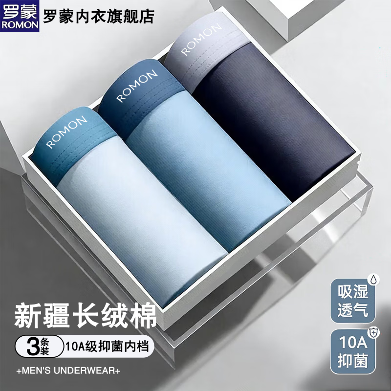 罗蒙(ROMON)纯棉高腰男士平角内裤10A级抑菌亲肤透气高腰男士平角内裤男士 紫兰+浅灰兰+浅兰 【新疆棉+10A级抑菌】 3条 2XL 135-160斤