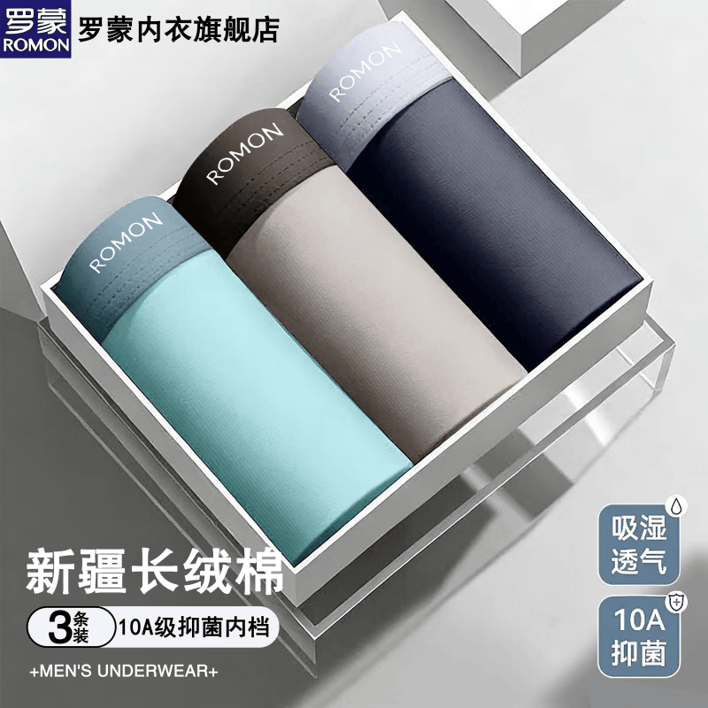 罗蒙(ROMON)纯棉高腰男士平角内裤10A级抑菌亲肤透气高腰男士平角内裤男士 紫兰+红灰+豆绿 【新疆棉+10A级抑菌】 3条 2XL 135-160斤