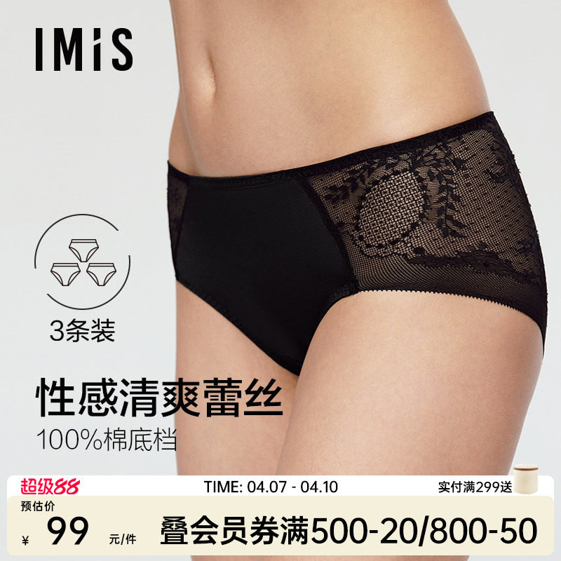 爱美丽3条装性感蕾丝中腰平角裤透气内裤纯棉底裆包臀不夹裆女士