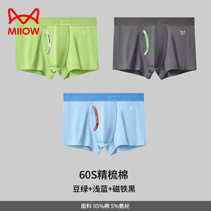猫人男士内裤男纯棉前开口透气平角裤抗菌短裤男生四角2026款夏季 【3条装】豆绿+浅蓝+磁铁黑 2XL 【推荐140-160斤】