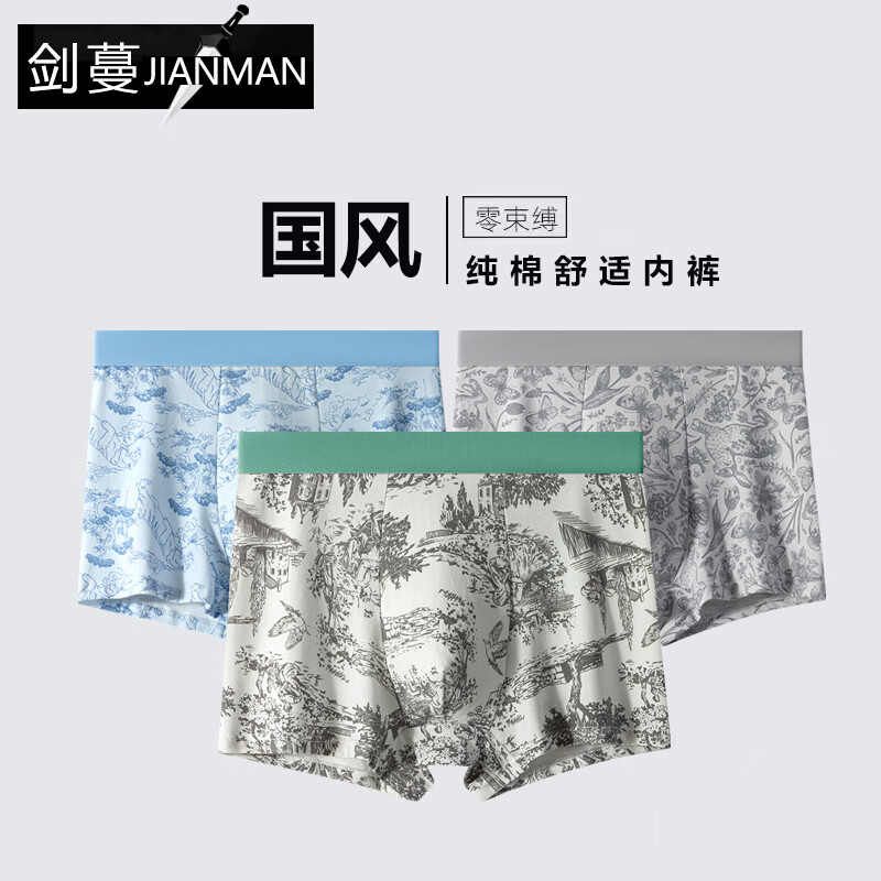 剑蔓纯棉男士内裤男平角裤中腰四季大码四角青年学生潮流短裤衩男生 纯棉【国风款】【3条装】混色 2XL 建议120-140斤