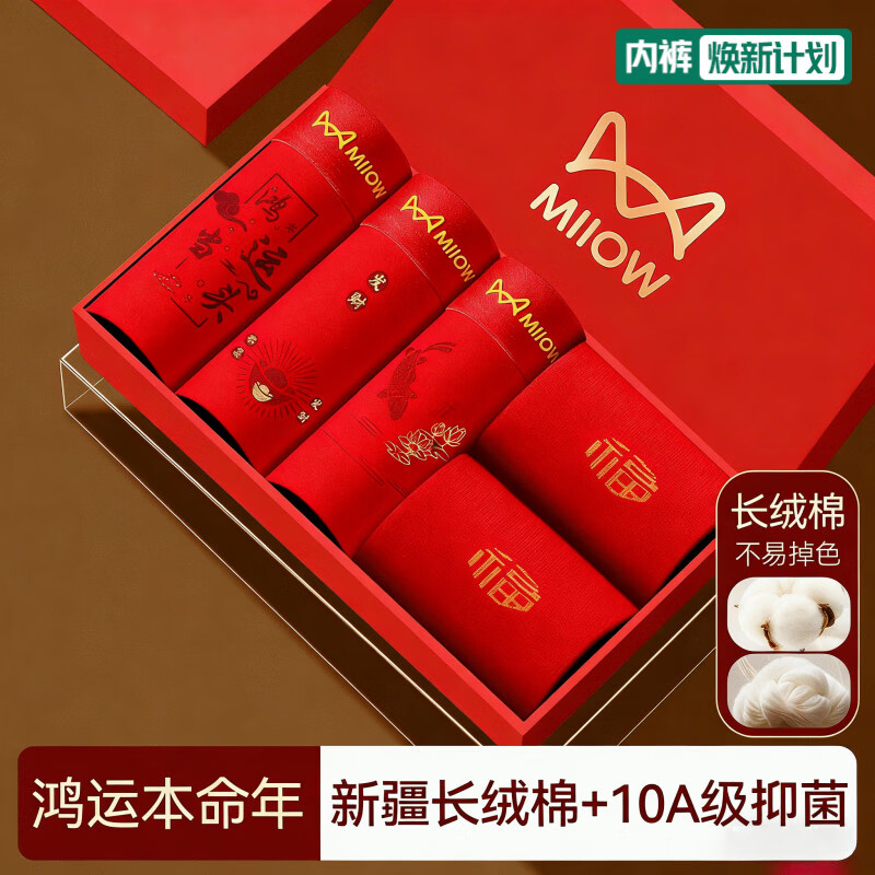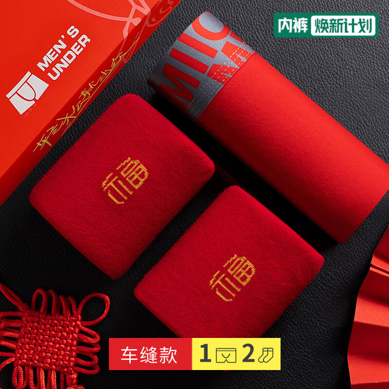 猫人(MiiOW)红色内裤男本命年马内衣套装纯棉平角裤结婚新婚大码四角短裤衩 扇解人意/如鱼得水/鸿运当头/2双红袜 3XL 【推荐:145-165斤】