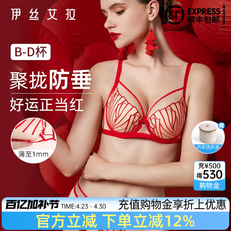 伊丝艾拉红色本命年内衣内裤套装女性感结婚新娘大胸显小蕾丝文胸
