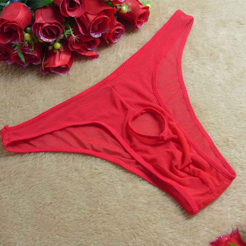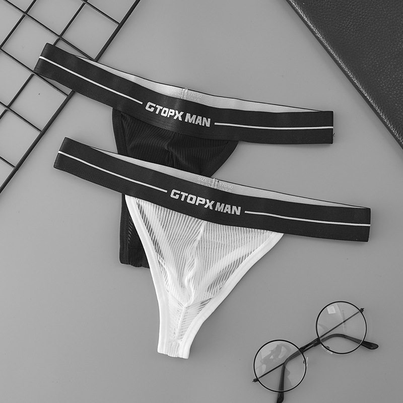 窄边男士全透明t型内裤透视网纱性感镂空丁字透气大囊袋青年裤衩