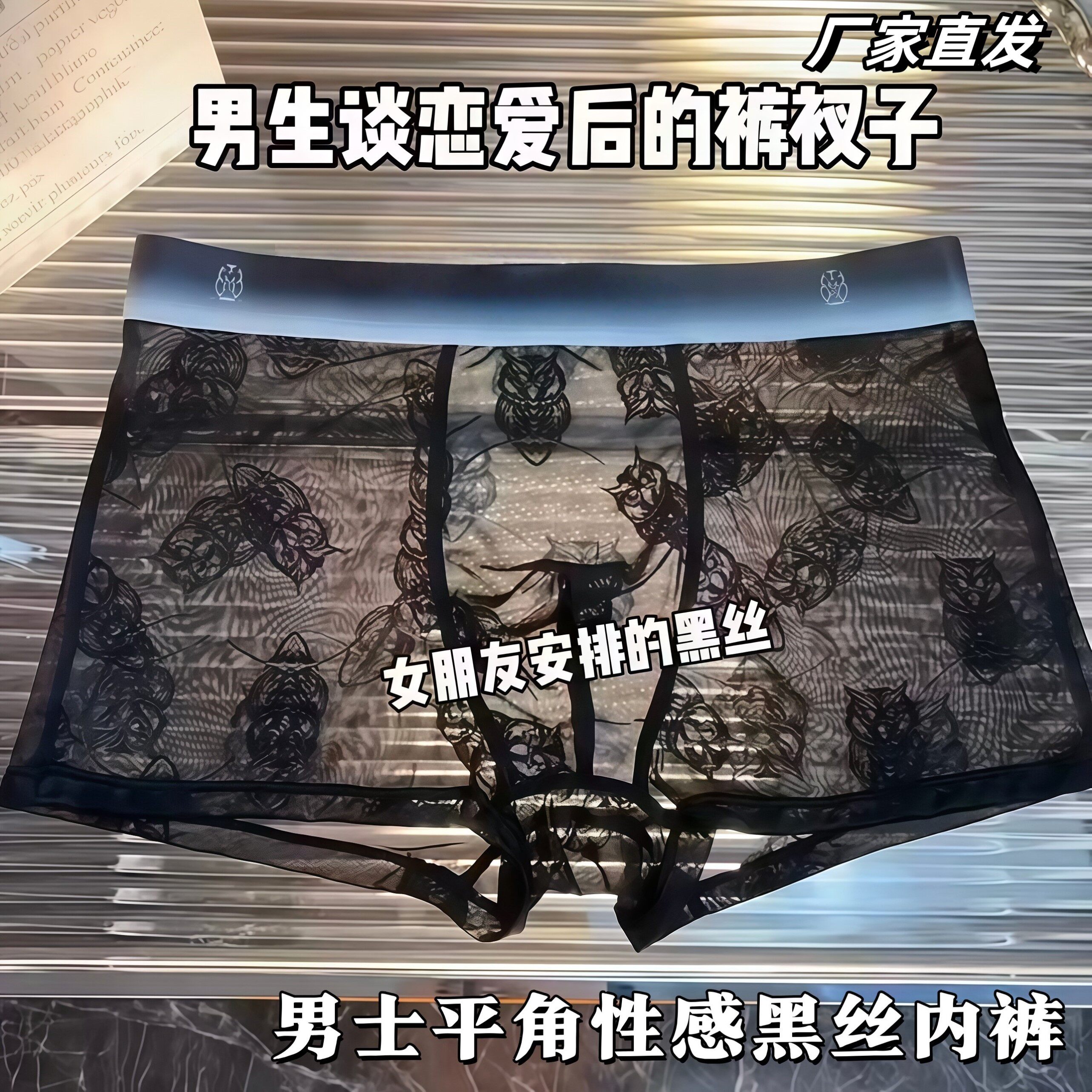 黑丝内裤创意冰丝性感平角裤透气网纱裸感短裤男士蕾丝超透明裤衩